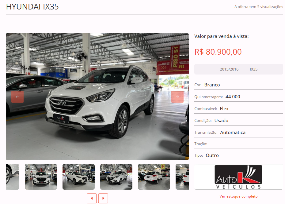 Entre as opções disponíveis em nosso site, está um HYUNDAI IX35, cor branco, ano 2015/2016, na loja Auto K Veículos. Todas as informações de contato estão disponíveis na nossa plataforma.