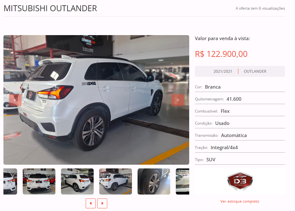 Entre as opções disponíveis em nosso site, está um MITSUBISHI OUTLANDER, cor branca, ano 2021/2021, na loja D3 Multimarcas. Todas as informações de contato estão disponíveis na nossa plataforma.