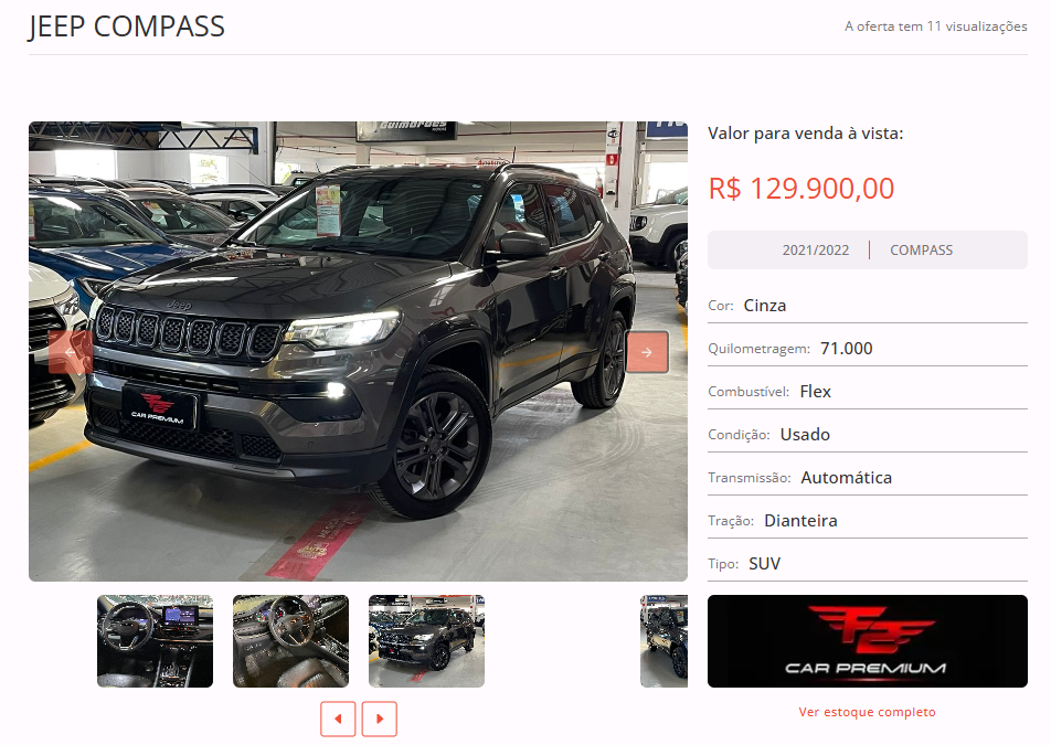 Entre as opções disponíveis em nosso site, está um JEEP COMPASS, cor cinza, ano 2021/2022 na loja F2 Car Premium. Todas as informações de contato estão disponíveis na nossa plataforma.