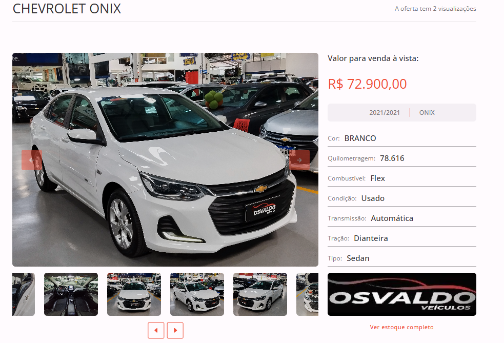 Entre as opções disponíveis em nosso site, está um CHEVROLET ONIX, cor branca, ano 2021/2021, na loja Osvaldo Veículos. Todas as informações de contato estão disponíveis na nossa plataforma.