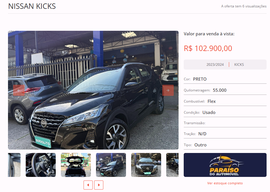 Entre as opções disponíveis em nosso site, está um NISSAN KICKS, cor preta, ano 2023/2024, na loja Paraíso do Automóvel. Todas as informações de contato estão disponíveis na nossa plataforma.