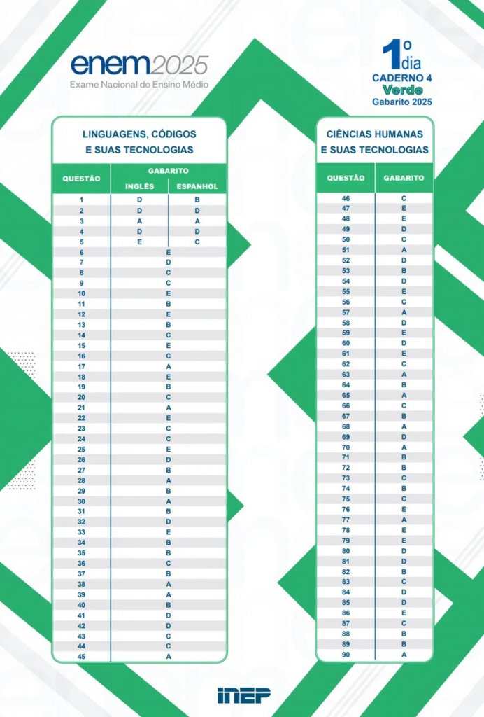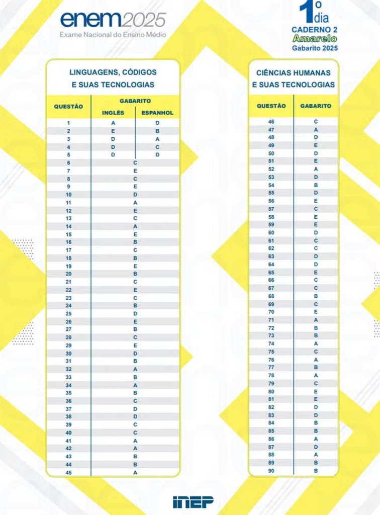 O Instituto Nacional de Estudos e Pesquisas Educacionais Anísio Teixeira (Inep) divulgou, nesta quinta-feira (13), o gabarito oficial da primeira prova do Exame Nacional do Ensino Médio (Enem) 2025, realizada no último domingo (9). As respostas das provas de Linguagens e Ciências Humanas foram publicadas na página oficial do Instituto (clique aqui).