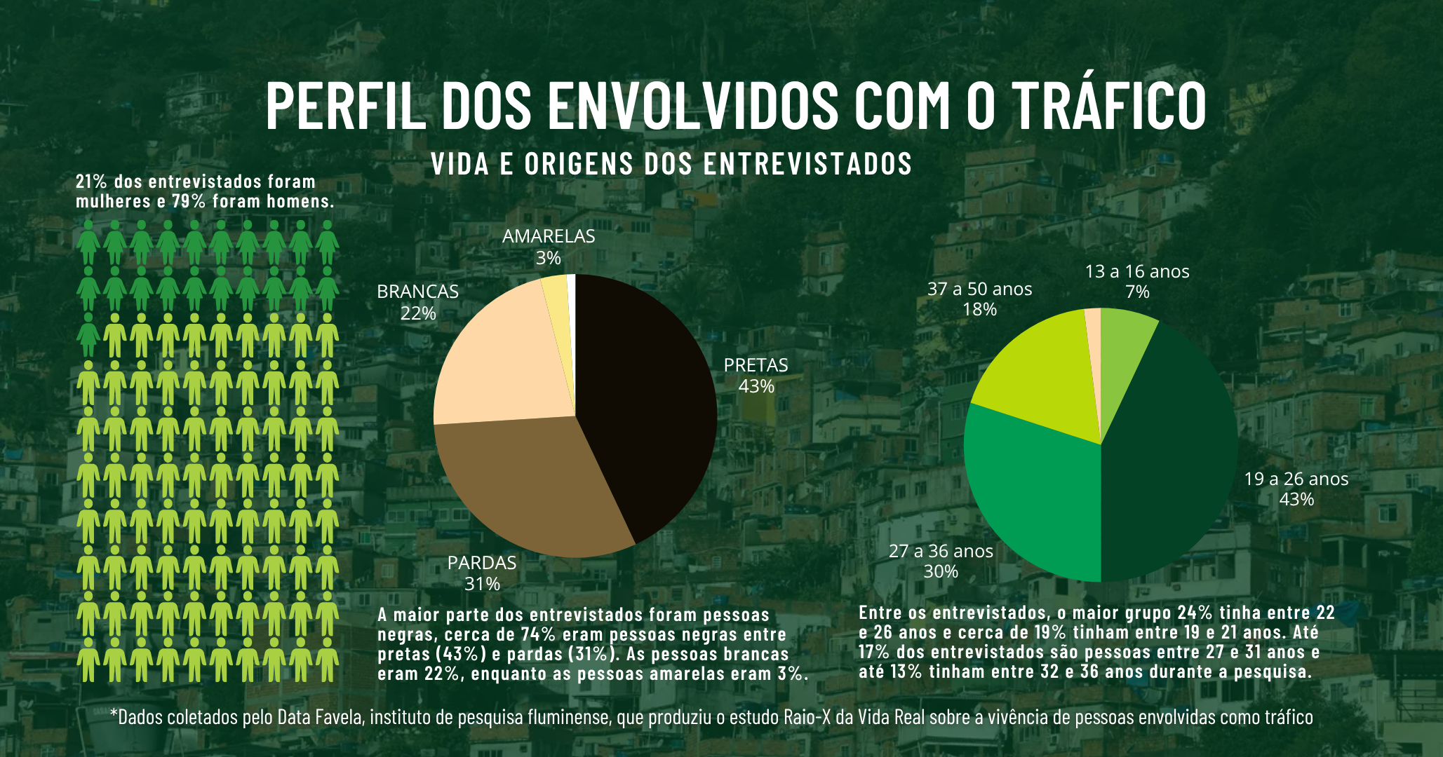 A pesquisa traçou o perfil de 3.954 entrevistados, abordados presencialmente entre os dias 15 de agosto e 20 de setembro em favelas de todas as regiões do país. Segundo os dados demográficos, 21% dos entrevistados foram mulheres e 79% foram homens. Entre os entrevistados, o maior grupo (24%) tinha entre 22 e 26 anos e cerca de 19% tinham entre 19 e 21 anos. Até 17% dos entrevistados são pessoas entre 27 e 31 anos e até 13% tinham entre 32 e 36 anos durante a pesquisa.