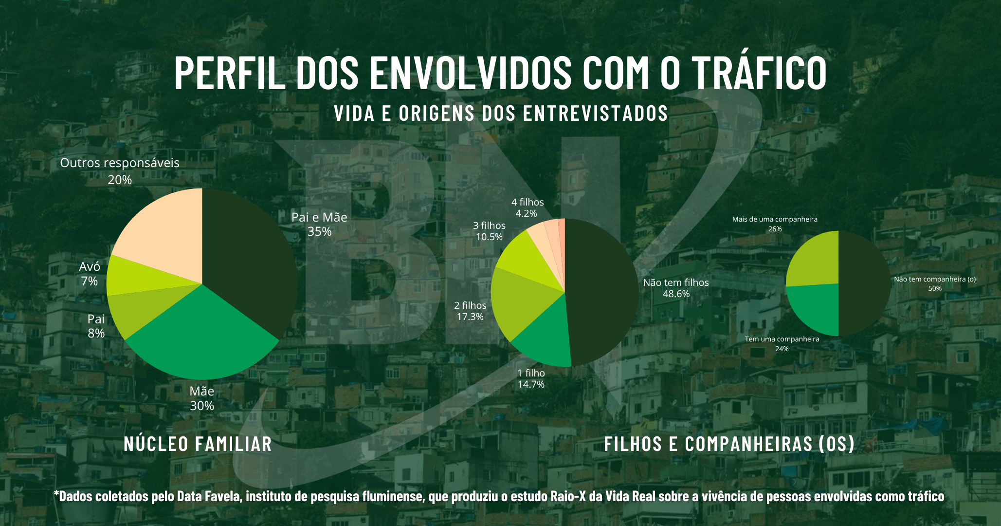No que diz respeito a outros vínculos afetivos, o estudo do Data Favela buscou informações sobre a parentalidade e os casamentos de pessoas envolvidas no tráfico de drogas. A maior parte, ou cerca de 52%, dos respondentes disseram ter filhos.