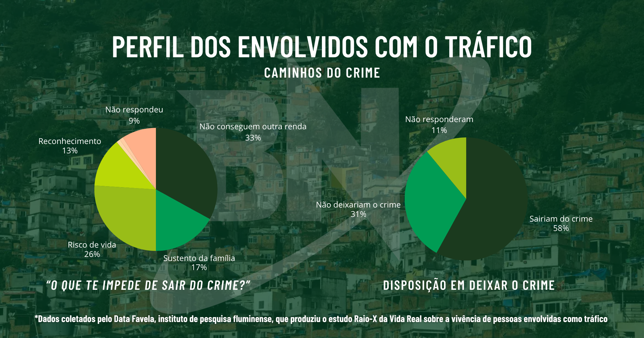 De acordo com o Data Favela, 58% das pessoas ligadas ao crime no país afirmaram que deixariam essa vida se tivessem oportunidade. Das alternativas capazes de motivar essa saída, aparecem empreendedorismo, emprego formal (CLT) e trabalho com flexibilidade, cada um mencionado por 57% desse grupo.