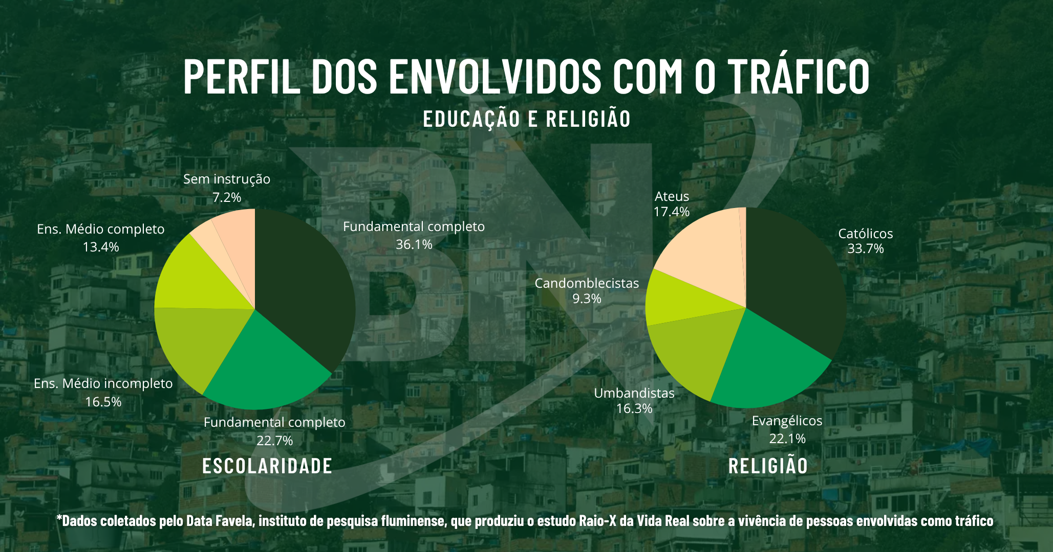 A maioria das pessoas envolvidas com tráfico de drogas no Brasil são negros, jovens e com filhos. É o que apontam os dados coletados pelo Data Favela, instituto de pesquisa fluminense, que revelou dados sobre a vivência de pessoas envolvidas com o tráfico de drogas por meio do estudo Raio-X da Vida Real, divulgado nesta segunda-feira (17).