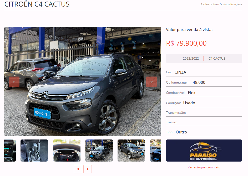 Entre as opções disponíveis em nosso site, está um CITROËN C4 CACTUS, cor cinza, ano 2022/2022, na loja Paraíso do Automóvel. Todas as informações de contato estão disponíveis na nossa plataforma.