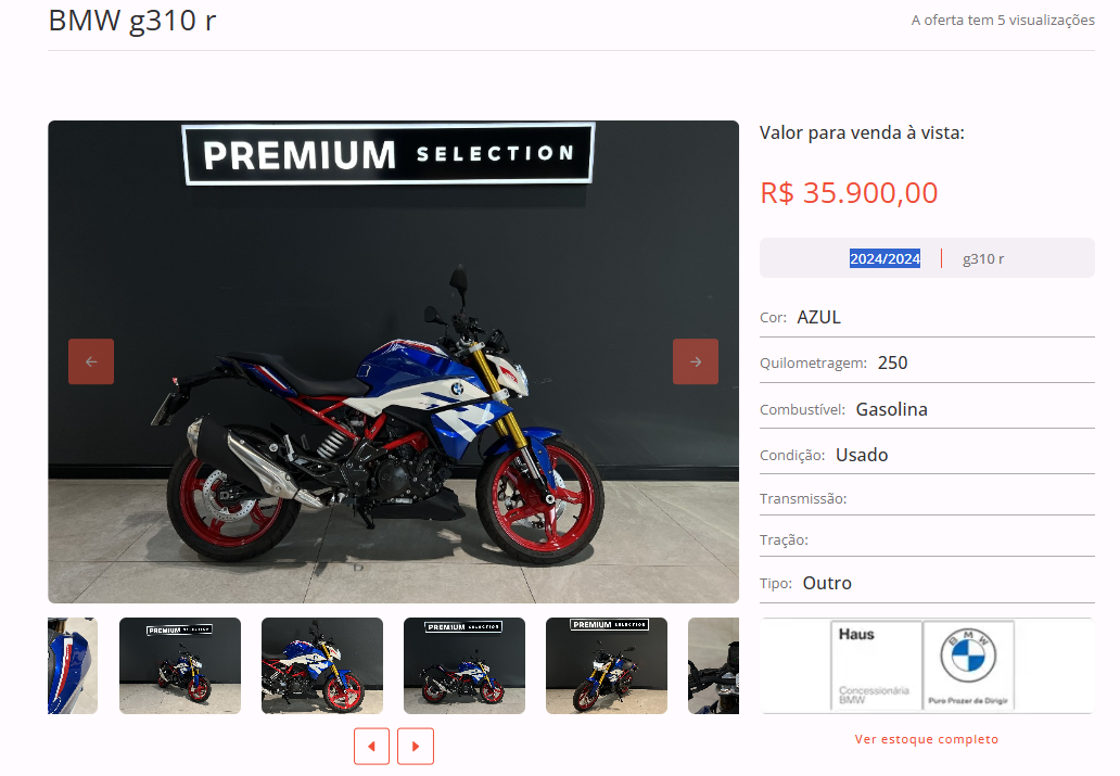 Entre as opções disponíveis em nosso site, está uma BMW g310 r, cor azul, ano 2024/2024, na loja BMW Haus Motors. Todas as informações de contato estão disponíveis na nossa plataforma.