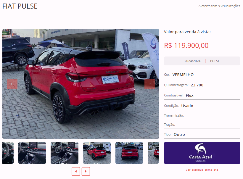 Entre as opções disponíveis em nosso site, está um FIAT PULSE, cor vermelha, ano 2024/2024, na loja Costa Azul Veículos. Todas as informações de contato estão disponíveis na nossa plataforma.
