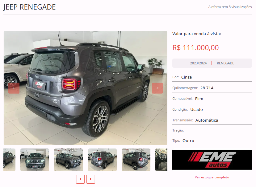 Entre as opções disponíveis em nosso site, está um JEEP RENEGADE, cor cinza, ano 2023/2024, na loja EME Autos Seminovos. Todas as informações de contato estão disponíveis na nossa plataforma.