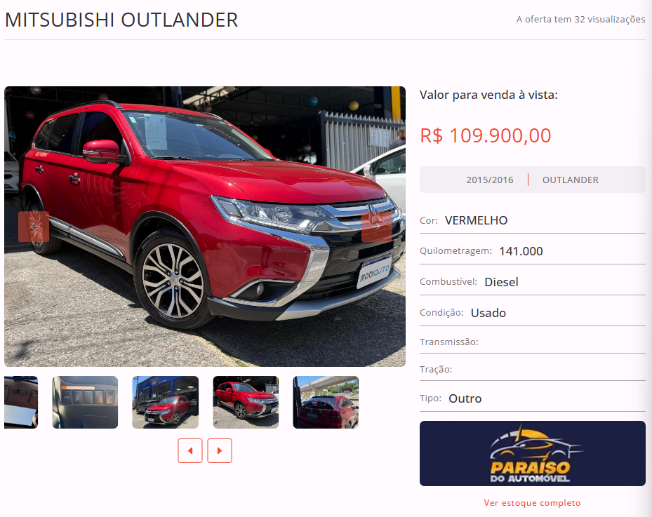 Entre as opções disponíveis em nosso site, está uma MITSUBISHI OUTLANDER, cor vermelha, ano 2015/2016, na loja Paraíso do Automóvel. Todas as informações de contato estão disponíveis na nossa plataforma.