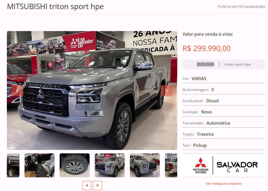 Entre as opções disponíveis em nosso site, está um MITSUBISHI triton sport, cor prata, ano 2025/2026, na loja Salvador Car Mitsubishi. Todas as informações de contato estão disponíveis na nossa plataforma.