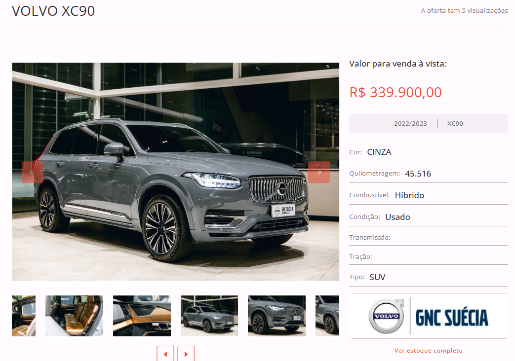 Entre as opções disponíveis em nosso site, está um VOLVO XC90, cor cinza, ano 2022/2023, na loja Volvo Cars GNC Suécia. Todas as informações de contato estão disponíveis na nossa plataforma.
