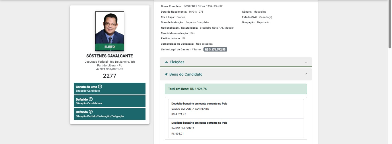 O líder do PL na Câmara, deputado federal Sóstenes Cavalcanti, declarou um patrimônio de R$ 4.926,76 à Justiça Eleitoral quando disputou as eleições de 2022. Nesta sexta-feira (19), o parlamentar foi alvo de uma busca e apreensão realizada pela Polícia Federal (PF), que localizou R$ 430 mil em espécie dentro de um saco preto, num endereço ligado ao bolsonarista.