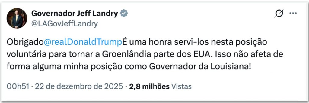 Em publicação em seu perfil na rede social X, Landry afirmou ser “uma honra servir” em uma posição voluntária para “tornar a Groenlândia parte dos Estados Unidos” e disse que a nomeação não interfere em seu cargo como governador estadual.