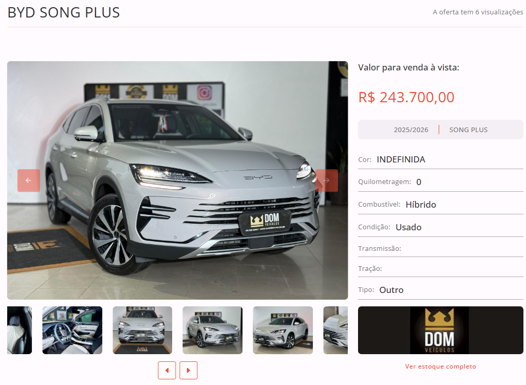 Entre as opções disponíveis em nosso site, está um BYD SONG PLUS, cor branca, ano 2025/2026, na loja Dom Veículos. Todas as informações de contato estão disponíveis na nossa plataforma.