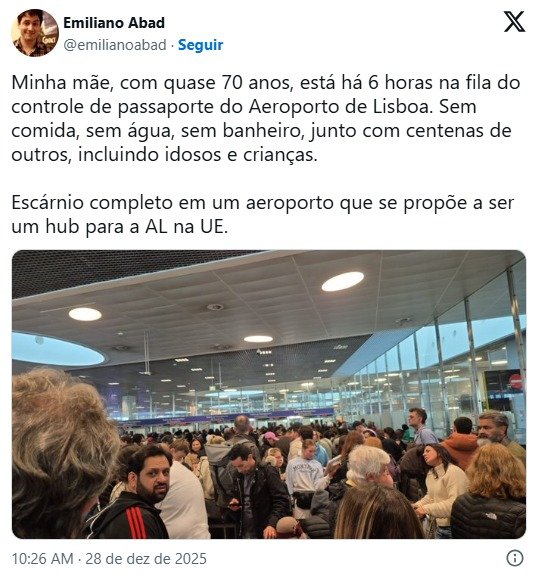 “Minha mãe, com quase 70 anos, está há seis horas na fila do controle de passaporte do Aeroporto de Lisboa. Sem comida, sem água, sem banheiro, junto com centenas de outros, incluindo idosos e crianças. Escárnio completo em um aeroporto que se propõe a ser um hub da América Latina na União Europeia”, escreveu.