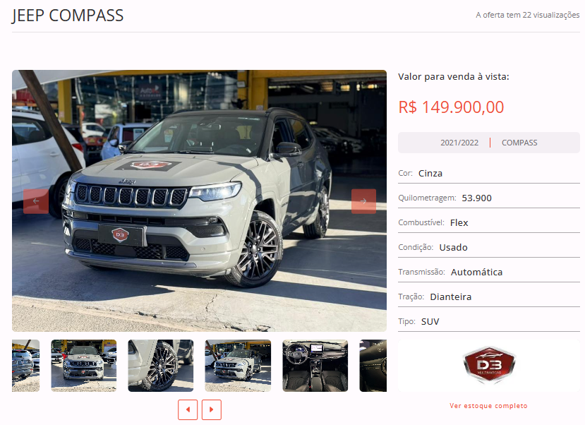 Entre as opções disponíveis em nosso site, está um JEEP COMPASS, cor cinza, ano 2021/2022, na loja D3 Multimarcas. Todas as informações de contato estão disponíveis na nossa plataforma.