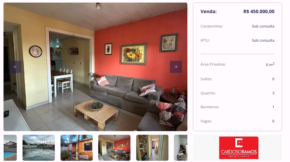Um dos imóveis disponíveis é uma casa de 249 m² em Caji, o imóvel conta com casa térrea em terreno plano de 249,83 m², com 56,25 m² de área construída, composta por 3 quartos, banheiro social, sala ampla, sala de jantar, cozinha e excelente área externa, com potencial para modificações e expansão. Localizada em condomínio com 120 casas, oferece segurança 24h, salão de festas, parque infantil, salão de jogos, piscina adulto e infantil e quadra de esportes. Próxima à Estrada do Coco, mercados, posto de gasolina e farmácia, ideal para quem busca conforto, segurança e boa localização.