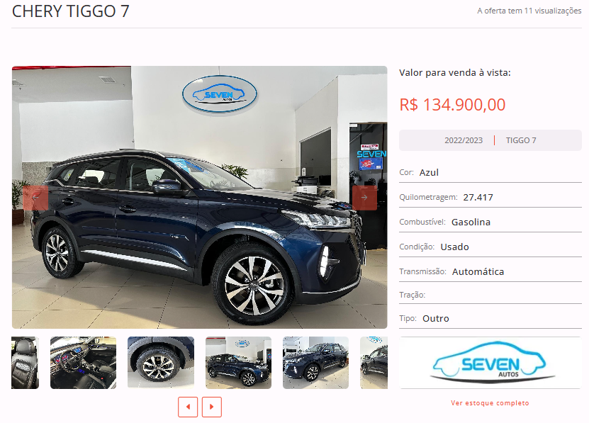 Entre as opções disponíveis em nosso site, está um CAOA CHERY TIGGO 7, cor azul, ano 2022/2023, na loja Seven Autos. Todas as informações de contato estão disponíveis na nossa plataforma.
