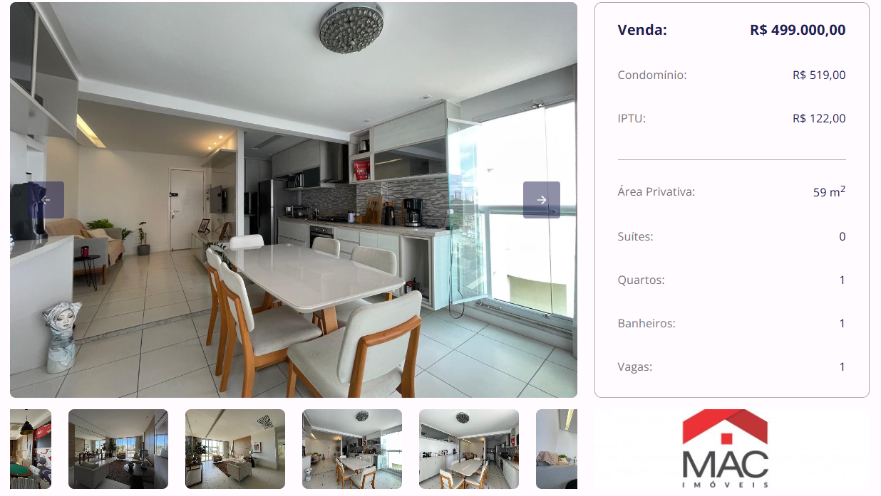 Um dos imóveis disponíveis é um apartamento de 59 m² em Rio Vermelho, o imóvel conta com um 1 quarto, varanda integrada à sala, cozinha com armários planejados, banheiro e 1 vaga de garagem com depósito. Apartamento nascente, em andar baixo, ideal para quem busca praticidade e conforto.