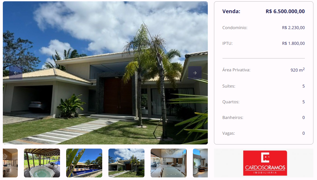 Um dos imóveis disponíveis é uma casa de 920 m² no Encontro das Águas, o imóvel conta com pé-direito duplo e arquitetura imponente, oferecendo amplitude e sofisticação em cada detalhe. Possui 5 suítes, sendo a master com closet espaçoso, gabinete exclusivo para home office e brinquedoteca planejada com possibilidade de reversão para suíte. Na área de lazer, dispõe de espaço gourmet completo, campo de futebol privativo, quadra de areia e canil, ideal para quem busca conforto, funcionalidade e lazer em um único lugar.
