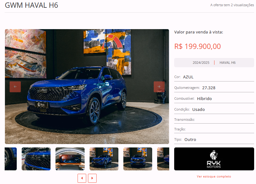 Entre as opções disponíveis em nosso site, está um GWM HAVAL H6, cor azul, ano 2024/2025, na loja RYK Motors. Todas as informações de contato estão disponíveis na nossa plataforma.