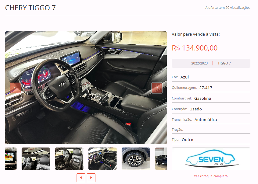 Entre as opções disponíveis em nosso site, está um CHERY TIGGO 7, cor azul, ano 2022/2023, na loja Seven Autos. Todas as informações de contato estão disponíveis na nossa plataforma.
