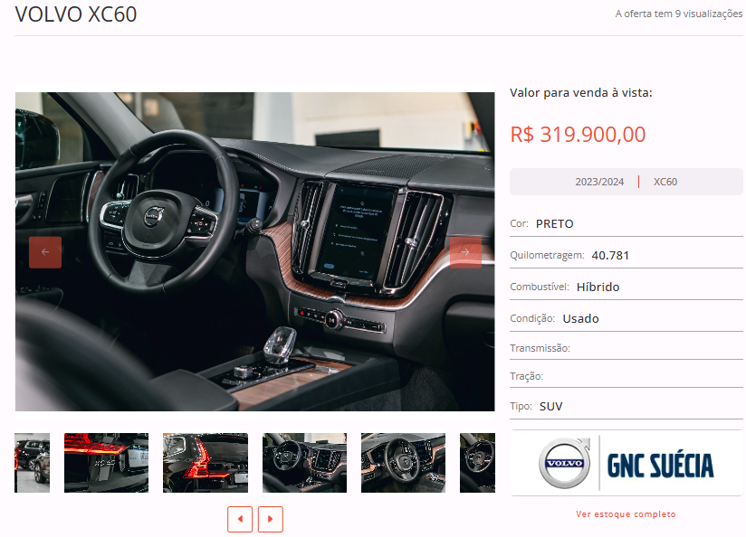 Entre as opções disponíveis em nosso site, está um VOLVO XC60, cor preta, ano 2023/2024, na loja Volvo Cars GNC Suécia. Todas as informações de contato estão disponíveis na nossa plataforma.