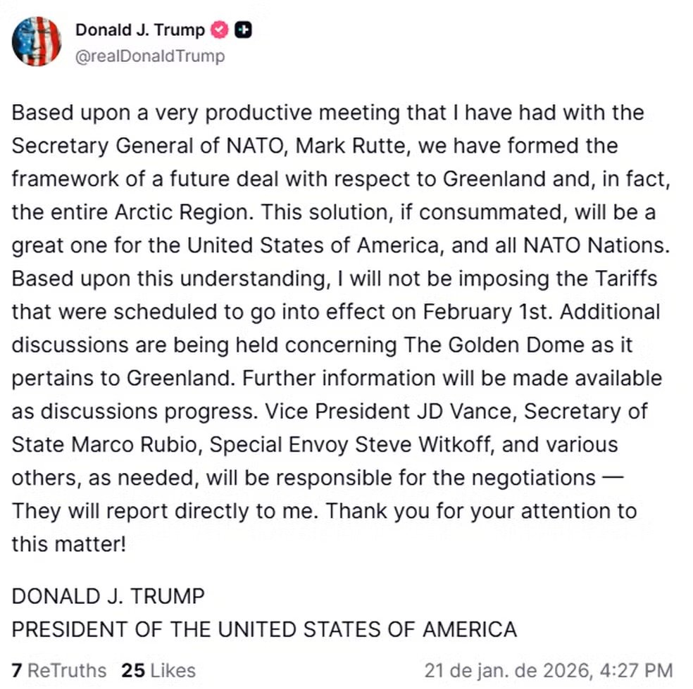 O presidente dos Estados Unidos, Donald Trump, afirmou que o governo norte-americano e a Organização do Tratado do Atlântico Norte (Otan) estabeleceram a estrutura de um futuro acordo envolvendo a Groenlândia e a região do Ártico. Em declaração dada na tarde desta quarta-feira (21), por meio de sua rede social, Truth Social, ele diz que o acordo atende aos interesses mútuos.
