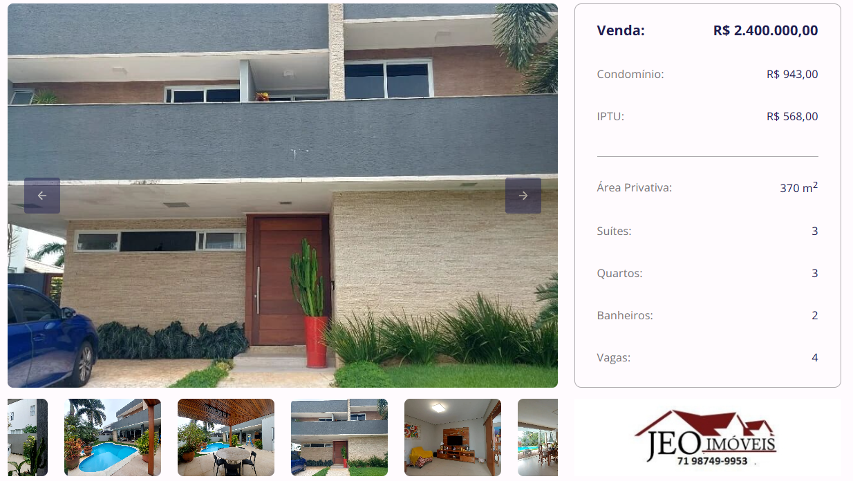 Um dos imóveis disponíveis é uma casa de 370 m² em Vilas do Abrantes, o imóvel conta com 370 m² de área construída em terreno de 470 m², localizado no Condomínio Alphaville Litoral Norte 1. Possui 3 suítes, sendo duas com closet, além de 1 gabinete no pavimento superior e 4 varandas. No térreo, dispõe de cozinha com despensa, dependência completa, salas de estar e jantar, home theater, área de serviço, espaço gourmet e sanitário da piscina. Conta ainda com 4 vagas de garagem e sistema de reservatórios com tanque de 2.500 litros no pavimento superior e 8.000 litros no térreo, oferecendo conforto, funcionalidade e exclusividade.