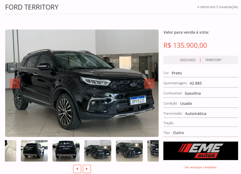 Entre as opções disponíveis em nosso site, está um FORD TERRITORY, cor preta, ano 2023/2023, na loja EME Autos Seminovos. Todas as informações de contato estão disponíveis na nossa plataforma.