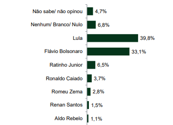 Na consulta espontânea, onde os nomes não são apresentados, Lula lidera com 25,5%, seguido por Jair Bolsonaro (12,1%) e Flávio Bolsonaro (6,3%).  44,2% dos eleitores afirmou que não sabe.