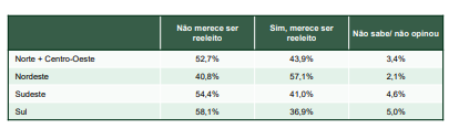 Regionalmente, o Sul do país apresenta a maior resistência, com 58,1% dos eleitores afirmando que o presidente não merece ser reeleito, enquanto o Nordeste mantém-se como o maior reduto governista, com 57,1% de aprovação ao merecimento da reeleição.