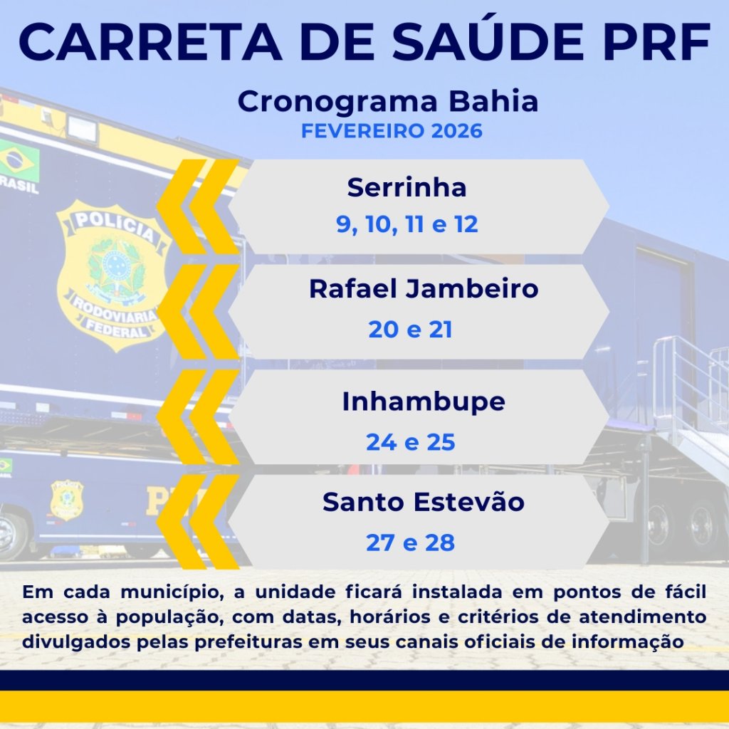 Carreta da Saúde da Polícia Rodoviária Federal (PRF) retorna a Bahia para um novo ciclo de atendimentos gratuitos à população. O equipamento passará por quatro cidades baianas com a oferta de atendimentos gratuitos em diversas áreas de saúde.