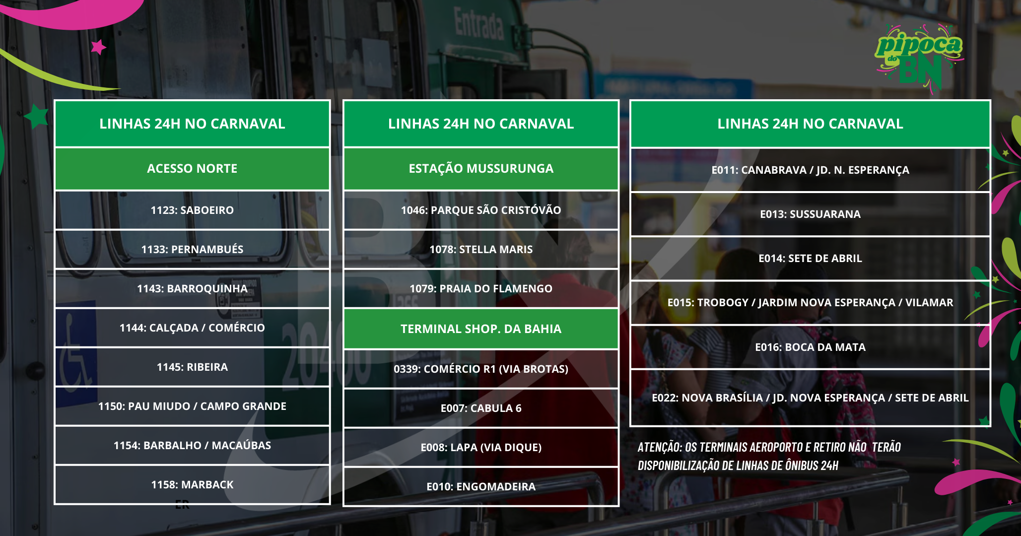 O Bahia Notícias destacou as linhas que passarão a funcionar no sistema 24h durante a folia: