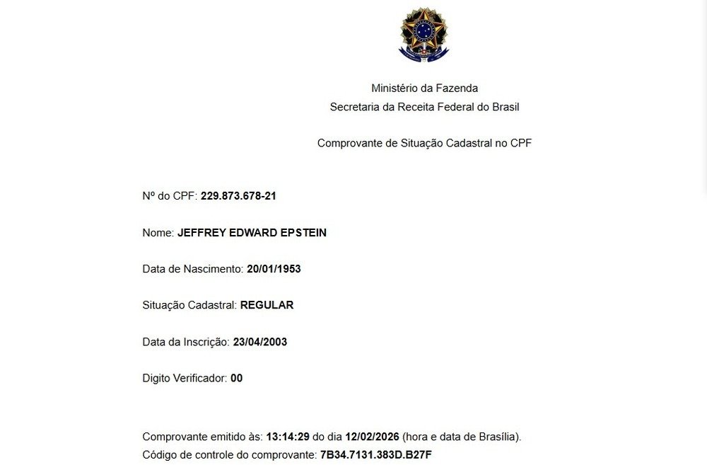 O criminoso sexual Jeffrey Epstein, que morreu em 2019 enquanto aguardava julgamento por acusações de exploração sexual de menores e tráfico humano, possui um CPF com situação regular junto à Receita Federal do Brasil. O documento expedido em nome de Epstein foi citado em uma lista de bens apreendidos pelas autoridades americanas, divulgada na mais recente leva de arquivos tornados públicos pelo Departamento de Justiça dos Estados Unidos.