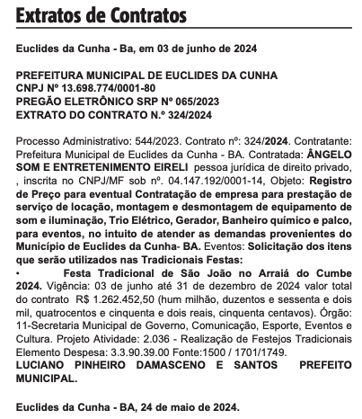 A medida atendeu a um pedido do MP-BA. Segundo a promotora de Justiça Laíse de Araújo Carneiro, autora da ação cautelar, já haviam sido gastos mais de R$ 1 milhão com o contrato nº 324/2024, firmado com a empresa para o São João daquele ano, e existia previsão de mais R$ 400 mil em novos ajustes para a realização do aniversário do município e outros festejos tradicionais.