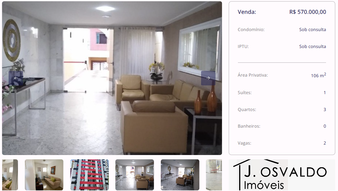 O imóvel conta com apartamento de 106 m², composto por 3/4, sendo 1 suíte, com possibilidade de reversão para 4/4, além de banheiro social, varanda e dependência completa. A sala e o corredor possuem piso em mármore, enquanto os quartos contam com piso cerâmico, garantindo praticidade e fácil manutenção. Dispõe ainda de 2 vagas de garagem.