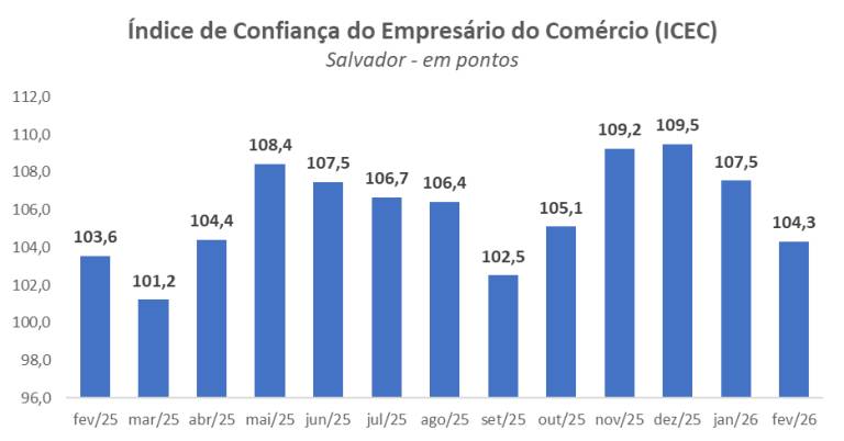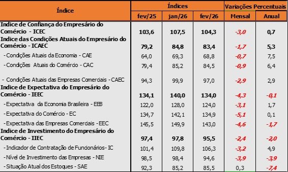 O Índice de Confiança do Empresário do Comércio (ICEC) registrou queda de 3% em relação a janeiro, retornando aos 104,3 pontos, após ter alcançado 107,5 pontos no mês anterior. Na comparação anual, entretanto, houve um crescimento de 0,7%.