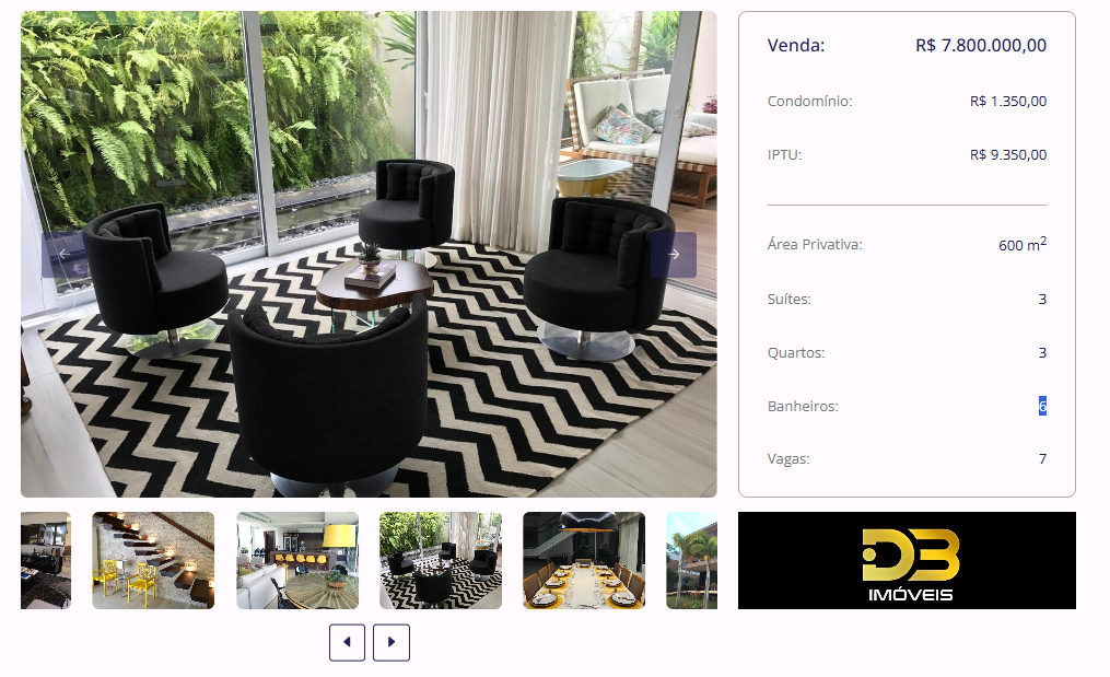 O imóvel conta com casa em ilha construída em terreno de 600 m², totalmente edificante, com projeto sofisticado e ambientes amplos. A residência dispõe de living de 100 m² com salas de estar e jantar integradas e climatização dutada, cozinha com ilha em mármore Calacata e equipamentos Kitchenaid, além de espaço gourmet de 48 m² totalmente equipado, com churrasqueira, máquina de gelo e cervejeiras. Possui ainda varandas mobiliadas, adega climatizada para 200 garrafas, mezanino com iluminação zenital e duas suítes amplas com closet e varandas, oferecendo conforto, tecnologia e alto padrão de acabamento.