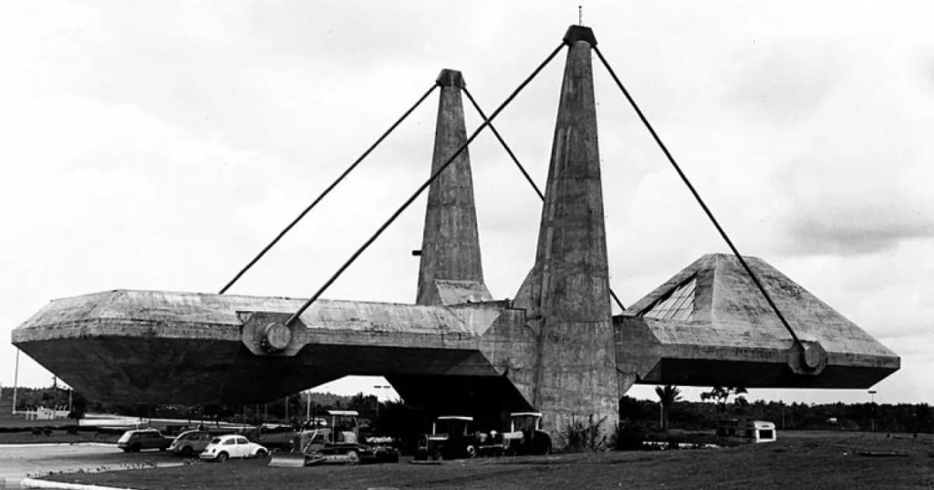O monumento foi executado em concreto aparente armado moldado in loco. A peça tem relação com um movimento arquitetônico, o “brutalismo”, que surgiu no início do século XX e alcançou seu auge nas décadas de 1950 a 1970. Sua estética ousada e impiedosa, caracterizada pelo uso de concreto bruto e aparente nas obras.