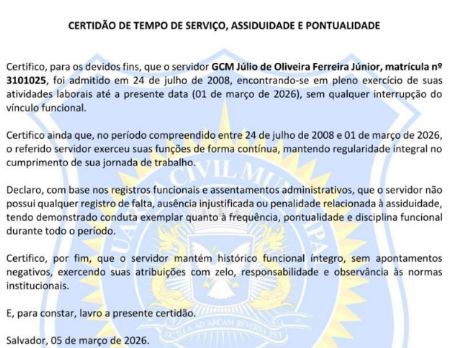O servidor Júlio de Oliveira, responsável por conduzir o veículo usado no crime, atua como corregedor na instituição. Segundo nova denúncia apresentada ao Ministério Público, o caso não foi devidamente investigado internamente. O Bahia Notícias teve acesso a uma certidão favorável ao investigado emitida pelo órgão em março deste ano. O documento comprova pontualidade, assiduidade e “histórico funcional íntegro” do servidor.