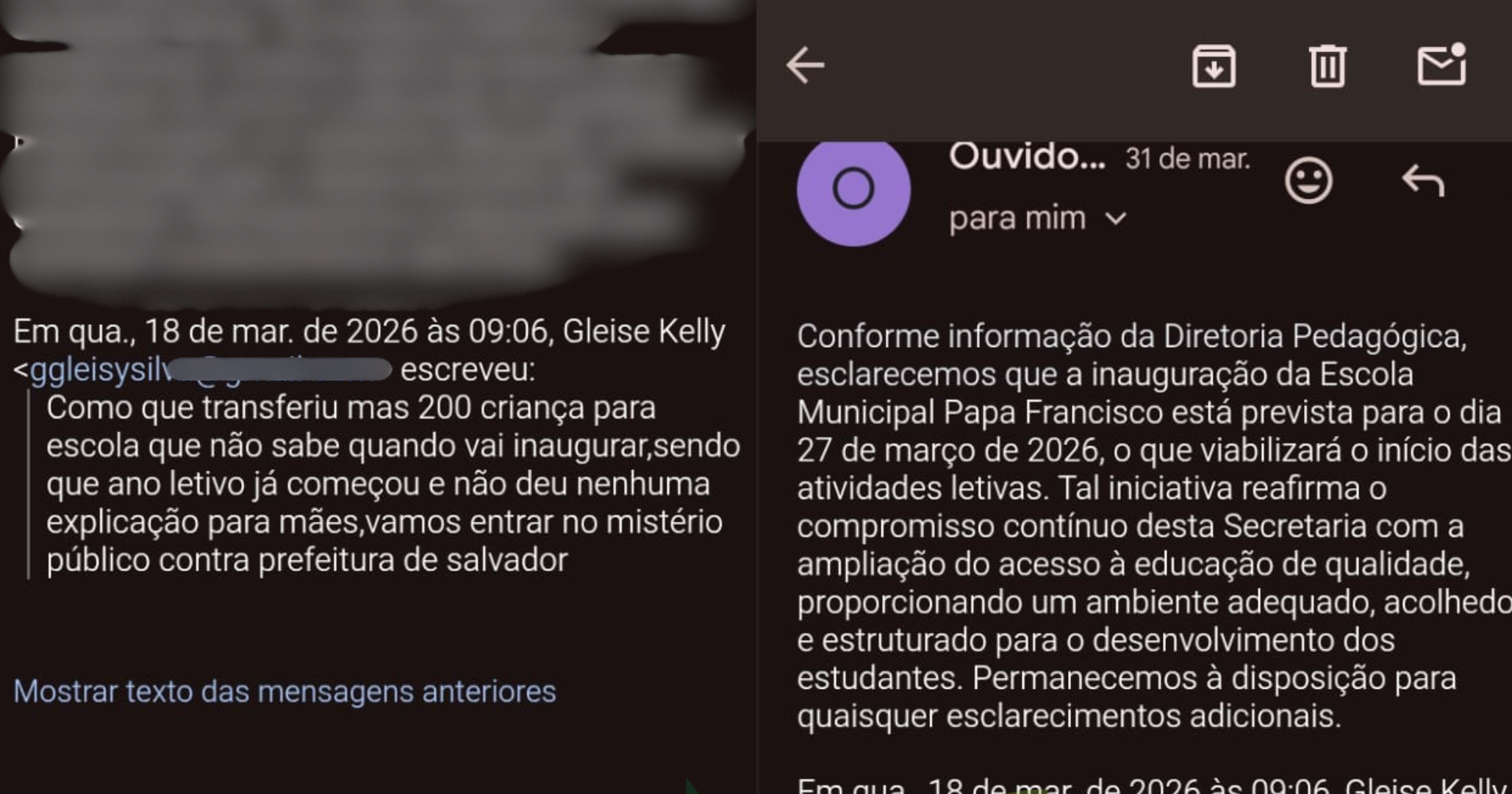 Gleyse, que formalizou um pedido de informações pela Ouvidoria da Prefeitura, canal oficial de denúncia e contato da gestão municipal, recebeu como resposta no dia 31 de março. O canal respondeu que a escola seria inaugurada no dia 27 – quando a inauguração já havia ocorrido –, com retomada imediata das aulas – o que não ocorreu.