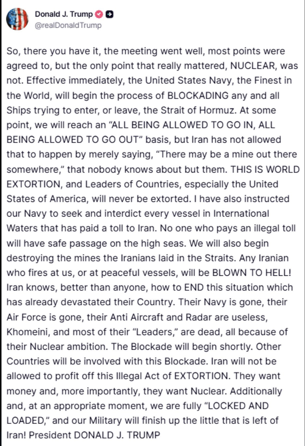 Ele afirmou ainda que o bloqueio contará com a participação de outros países e que as Forças Armadas estão prontas para “terminar o pouco que resta do Irã”, alegando que a infraestrutura militar de Teerã já estaria devastada. “A Marinha deles acabou, a Força Aérea deles acabou. A defesa antiaérea e o radar deles são inúteis”, escreveu Trump, acrescentando: “A Marinha dos EUA iniciará o processo de BLOQUEIO de toda e qualquer embarcação que tente entrar ou sair do Estreito de Ormuz. Estamos totalmente ‘travados e carregados’.”