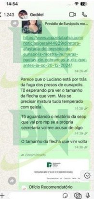 Ainda no dia 18, em um dos momentos de nervosismo, quando se preocupava com um decisão por prisão preventiva, Joneuma critica o superintendente de Gestão Prisional da Secretaria de Adminsitração Penitenciária (Seap), Luciano Teixeira. Em mensagem, a ex-diretora chega a insinuar, inclusive, que a Seap estaria fazendo os servidores a deporem contra ela e sugere que a situação estaria ocorrendo em “conluio” com o desembargador Roberto Maynard Frank.