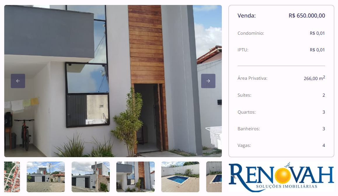 O imóvel conta com casa duplex localizada na Rua Tamboril, nº 6, no bairro Kennedy, em Alagoinhas/BA, composta por 3 dormitórios, sendo 2 suítes e 1 com closet, além de banheiro social e banheiro de serviço. Dispõe de sala, copa, cozinha, lavanderia, quintal, 2 varandas e área gourmet com churrasqueira, além de piscina para momentos de lazer. Possui garagem para até 4 veículos, sendo 2 cobertas e 2 descobertas, oferecendo conforto, funcionalidade e boa distribuição dos espaços.