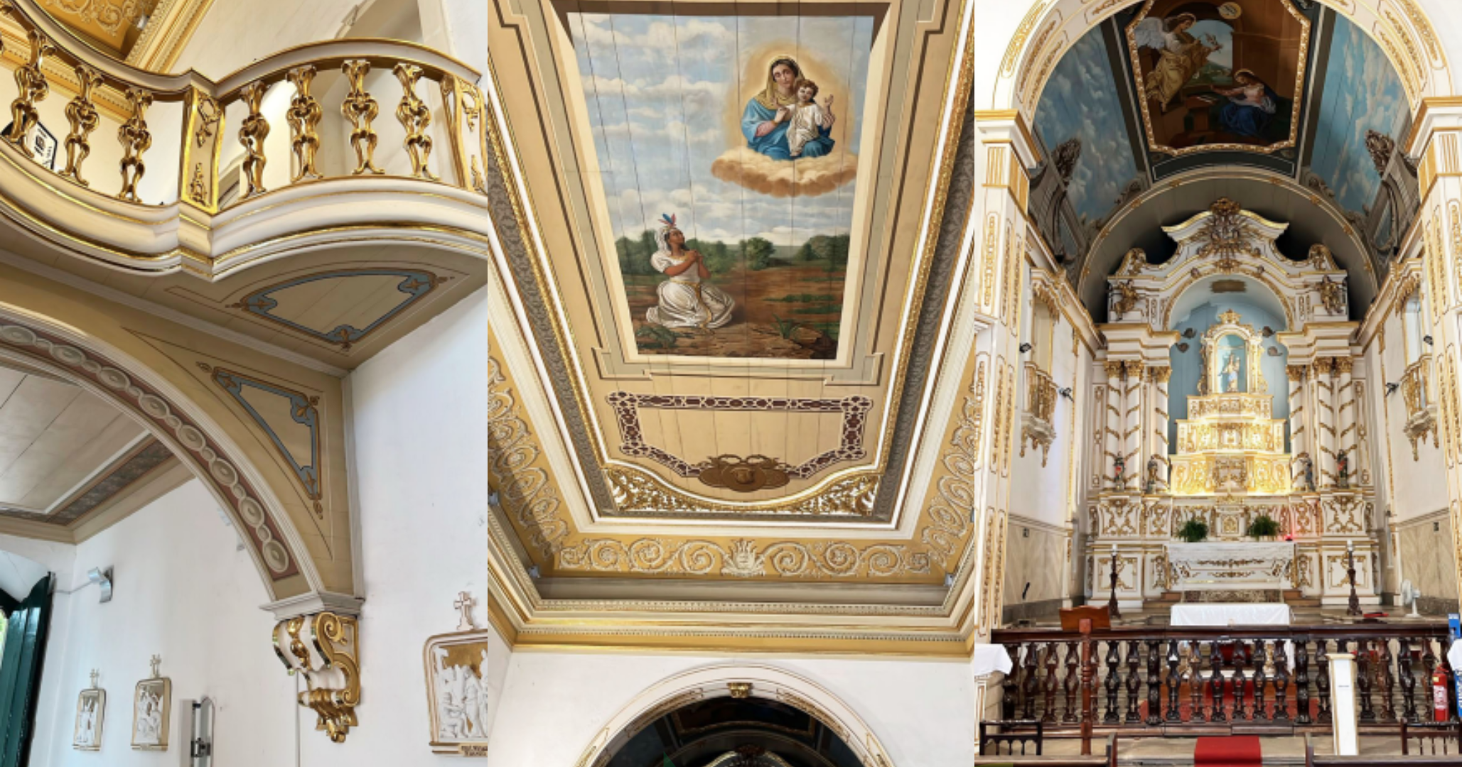 f) Seguem fotos, que demonstram a beleza e a conservação da capela-mor e da nave da igreja, provas inequívocas da inexistência de qualquer infiltração de água em suas dependências."
