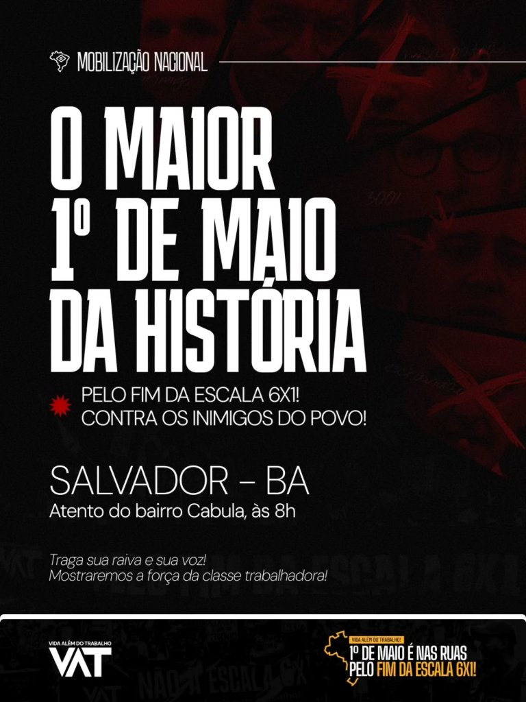 Uma mobilização pelo fim da escala 6x1 está prevista para o dia 1º de maio, em Salvador, reunindo organizações, movimentos sociais e grupos independentes. O ato será realizado a partir das 8h, no bairro do Cabula, e faz parte de uma manifestação nacional.