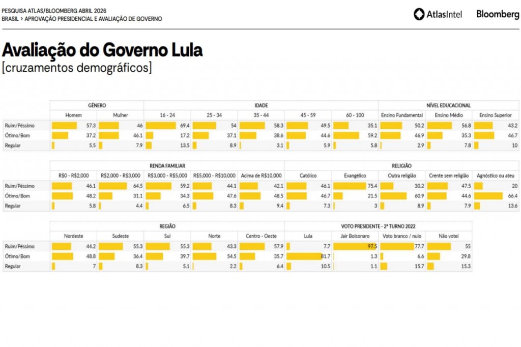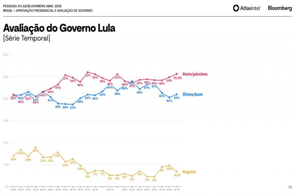 No mês de abril a rejeição ao governo Lula (PT) aumentou na comparação com março, de acordo com a pesquisa. Atualmente, 51,3% dos brasileiros consideram o governo ruim ou péssimo, ante 50% em março.